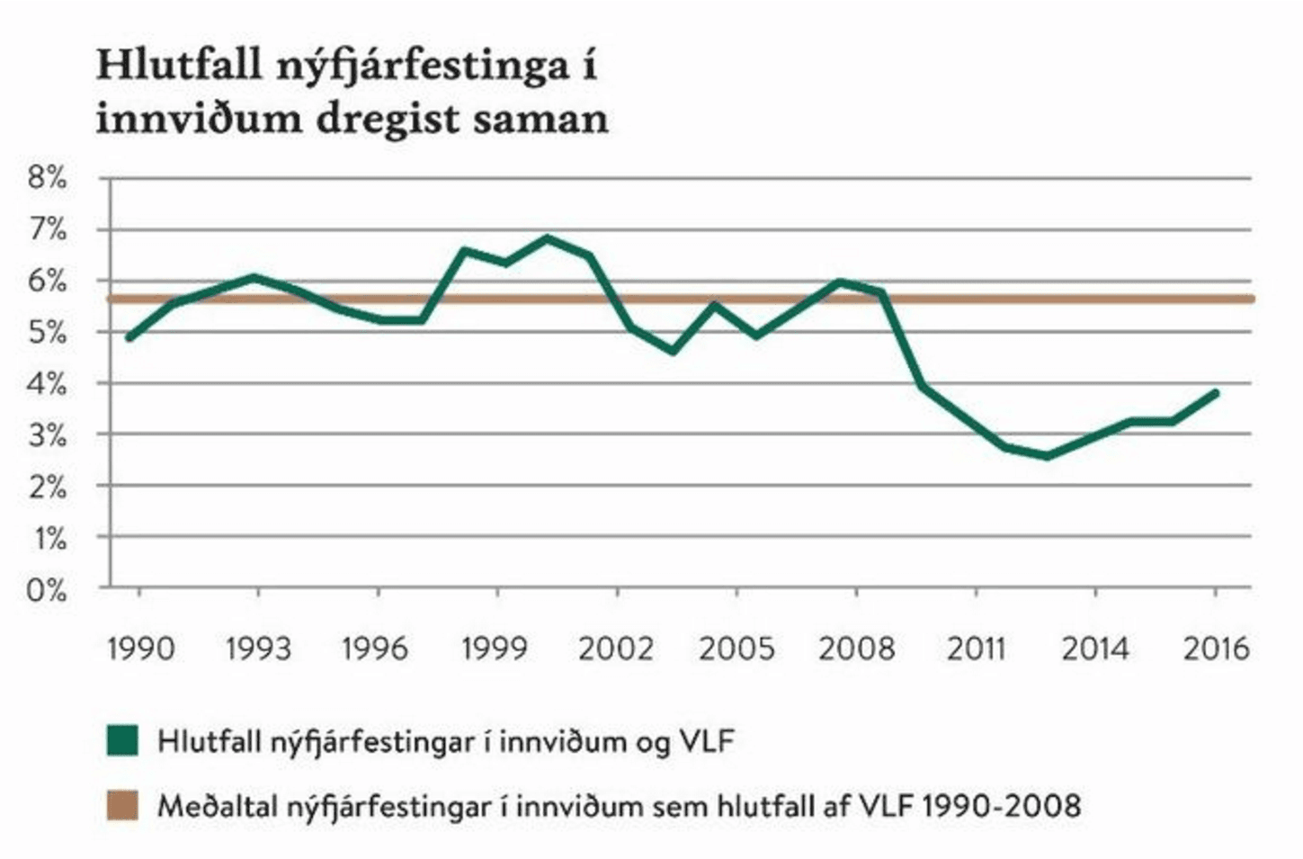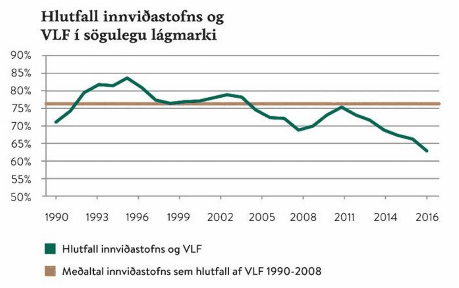 Hún sýnir vaxandi innviðastofn sem hlutfall af landsframleiðslu í kjölfar þjóðarsáttasamningana fyrir 1990, ekki síst vegna minnkandi hagvaxtar og landsframleiðslu, en síðan nokkuð jafna og örugga hrörnun fram að Hruni, einkum eftir að skattalækkunaráform Sjálfstæðisflokksins náðu fram upp úr aldamótum; afnám eignaskatta, tekjuskattar fyrirtækja færðir niður í 15% og fjármagnstekjuskattur í 10%. Hrörnun innviða helst fullkomlega í hendur við hrörnun skattkerfisins. Skattheimtan þjónar ekki lengur hagsmunum samfélagsins heldur aðeins hinum ríkustu.